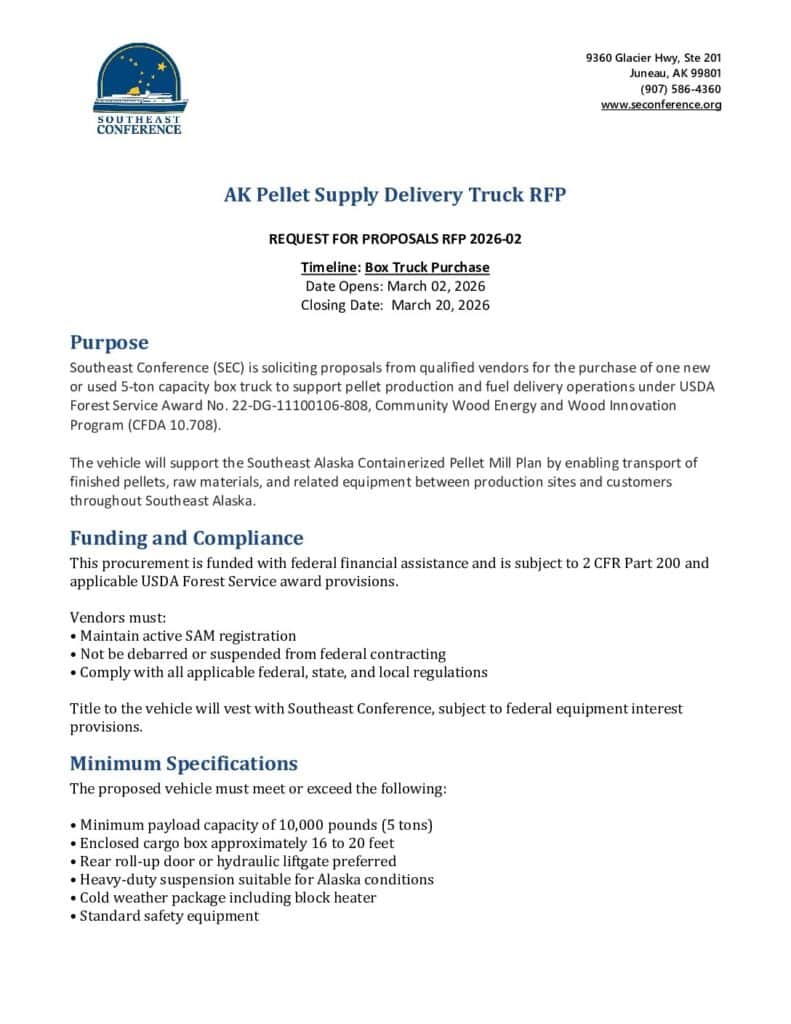 Southeast Conference (SEC) is soliciting proposals from qualified vendors for the purchase of one new or used 5-ton capacity box truck to support pellet production and fuel delivery operations under USDA Forest Service Award No. 22-DG-11100106-808, Community Wood Energy and Wood Innovation Program (CFDA 10.708).