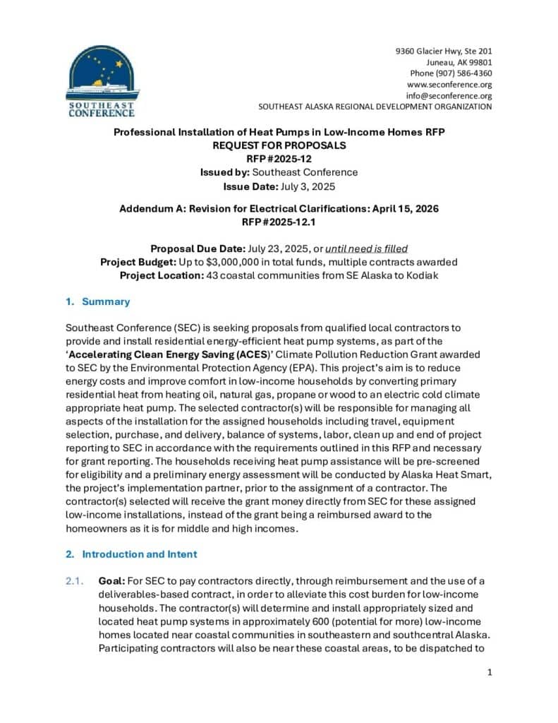 This addendum clarifies the participation and reimbursement of electrical contractors under the ACES low-income program. Qualifying electrical contractors who respond to this RFP may be eligible to participate in direct-pay reimbursement arrangements when a household’s heat pump installation cost falls below the $8,500 low-income program cap (#2 below). In these cases, remaining available funds may be allocated, on a case-by-case basis and with SEC approval, to cover eligible electrical scope required to complete the installation.